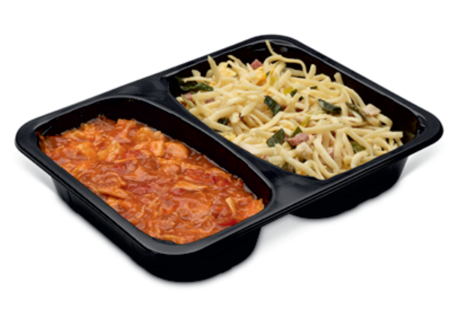 PP trays are most commonly used on the market. They have good property of sealability of the lidding film that can make strong lock seal. Big advantage is high temperature resistance up to +110C what makes them ideal choice for packaging hot cooked meals.